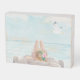 Beautiful wood hanging of woman sunning herself on dock at the beach with seagull.