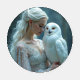 Beautiful A stunning woman with icy white locks cascading down her back, dressed in a breathtaking silver gown adorned with intricate crystal sequins, delicate silk threads, and subtle, shimmering embroidery, cradles a sleek white owl perched elegantly on her arm. The owl's feathers are smooth and lustrous, its piercing eyes gleam with a soft, ethereal light, as the woman gently strokes its plumage with slender fingers.