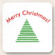 Tree in lines of green, lines decrease in length from bottom to top. The red text that curves above the trees reads "Merry Christmas!"