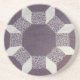 Quilted block in purple and white "spool" pattern. Eight spools rotate around a center of dark purple. A purple flower print is the "thread" on the spool. With no frame for each block, the pattern gives a kaleidoscope effect.