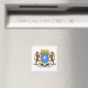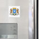 Display your national pride with this Coat of Arms of Somalia Magnet. The design features the official Somali emblem, which consists of a blue shield with a central white five-pointed star (the Star of Unity), supported by two upright leopards. Below the shield are two crossed spears and palm fronds, representing the strength and natural beauty of the nation.