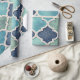 A seamless geometric pattern wrapping paper inspired by classic Mediterranean and Moroccan tilework. This design features elegant quatrefoil shapes in rich shades of cobalt blue, teal, and aqua, accented with light cream outlines and subtle marbled textures. The combination of deep ocean hues and cracked-stone details creates a timeless yet modern aesthetic. Perfect for those who love artistic geometry, coastal tones, and refined tile-inspired artistry that evokes both tradition and contemporary design.