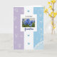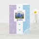 This card features a calm mix of pastel tones and natural imagery, with a tall white panel running down the center like a neat frame for the main details. Near the top of that center panel sits a rectangular photo of deep blue flowers, each bloom marked by a bright yellow center against soft green foliage, creating a tender, romantic feel ❤️. Just below the photo, a short greeting appears in flowing cursive-style lettering in a dark tone, centered neatly on the white space. On the left side, a vertical band of soft lavender is decorated with thin white outlines of abstract flowers and small starburst shapes, like gentle doodles drifting upward. On the right side, a vertical band of light sky blue shows white looping lines that cascade downward, suggesting two paths quietly weaving together. Small teal heart icons are placed along the central white column, adding little pauses of affection 🌼. In the lower right corner, the blue section finishes with an intricate white lace-like pattern that looks finely detailed and airy.