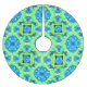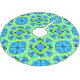 Tree Skirt in a tie dye pattern in shades of cobalt blue, turquoise, and lime green, accented with white