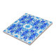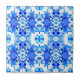 Ceramic tile in a batik effect, tilled pattern, with abstract floral elements, in shades of denim, cobalt and sky blue against a white background