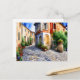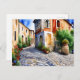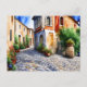 This digital graphic is a watercolor painting of a cobblestone path in a Mediterranean setting. The painting is hyper-realistic with intricate detail.