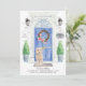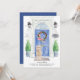Announce your new address with our stylish announcement featuring a Champagne cockapoo, blue front door, welcome mat, slate sign, topiaries and a floral wreath set on a gray brick background.