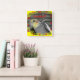 A closeup shot of a Cockitiel that's bright and colorful with a gray background that's on a WALL CLOCK.