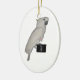 A photograph of a cute white cockatoo posing with a food bowl on an ornament