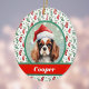 This cute ornament feature charming artwork of a cocker spaniel puppy, which has a watercolor look. It's set against a sparkly sage green and sparkle lights background, and then bordered in a darker green with a red and green Christmas stocking repeat pattern. Your or your recipient's dog's name appears in white on a red and green banner underneath the picture.