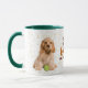 "Cocker puppy kisses fix everything" declares this mug for the Cocker Spaniel Dog owner. The image on each side is a portrait of an adorable buff colored American Cocker Spaniel puppy. The images and text are placed on a white background that is sprinkled with gold confetti.