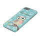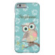 The owl in shades of light chocolate brown and its body has a pink rose with lime green leaves and white circular pattern. The wings are in chocolate brown with white pattern. The leaves on a branch are in dark orange, teal, lime. The background is in light teal with white berries pattern. The text is in chocolate brown as well and it's customizable. This is a digital illustration.