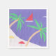 These cocktail napkins are designed with an island scene of palm trees, umbrellas, and a blue ocean with a red sailboat.