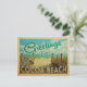 This Greetings From Cocoa Beach vintage postcard design features a sandy beach with a beautiful turquoise ocean water and above the sea, a blue sky with billowy white clouds. In vintage travels style.