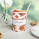 Enjoy hot cocoa and cider this autumn in our Cocoa Stripes & Golden Fall Leaves Customizable to-go travel cup featuring a botanical watercolor illustration of golden maples leaves turning beautiful shades of rust, orange, yellow, red, tan and brown! All text can be updated to create a custom accent, perfect for your thanksgiving gathering, pumpkin harvest or by the bonfire in your backyard, park or picnics.