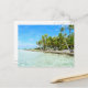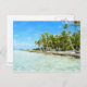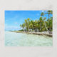 Postcard of coconut palm trees on a white sand beach on the tropical atoll Rangiroa in the Tahiti archipelago French Polynesia in the Pacific Ocean.