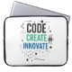 "Guard your creation hub with this innovation-themed sleeve featuring 'CODE CREATE INNOVATE' and binary patterns - military-grade neoprene absorbs shocks while powering maker journeys. Water-resistant + fits 13-16" laptops with anti-slip base. Essential for developers and hardware innovators. **Secure your digital workshop today!**"