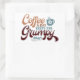 A funny and sarcastic retro-style graphic showcases a steaming cup of coffee bursting with energy. The vibrant text reads, "Coffee a day keeps the grumpy away." This playful design is featured on a variety of products, making it a perfect gift for coffee enthusiasts.