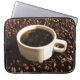 This laptop sleeve displays a white demitasse cup of steaming freshly brewed coffee set on a bed of dark brown roasted coffee beans.