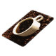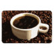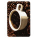 This flexible magnet displays a white demitasse cup of steaming freshly brewed coffee set on a bed of dark brown roasted coffee beans.