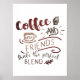 Coffee poster for your home, bistro decor or restaurant art. The design features the coffee quote "Coffee and Friends make the Perfect Blend" and illustrations including a cup of coffee and cupcake dessert. The decorative typography is lettered in neutral brown earth tones. Welcoming piece for your business or lovely gift for coffee lovers and your friends.