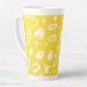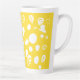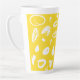 This mug exhibits different shapes white spots and circular lines symbolizing coffee beans, over a yellowish orange surface. The illustration is hand drawn.
