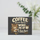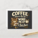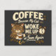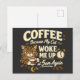 Cute postcard ideal for coffee lovers and cat lovers featuring a grumpy looking cat holding a mug of morning coffee. In fun text are the words, "Coffee, because my cat woke me up at 5 am again". Other images around the design are an alarm clock set to 5, coffee beans and a little moon and sleepy Z signs.
