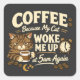 Cute sticker ideal for coffee lovers and cat lovers featuring a grumpy looking cat holding a mug of morning coffee. In fun text are the words, "Coffee, because my cat woke me up at 5 am again". Other images around the design are an alarm clock set to 5, coffee beans and a little moon and sleepy Z signs.