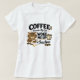 Cute T-shirt ideal for coffee lovers and cat lovers featuring a grumpy looking cat holding a mug of morning coffee. In fun text are the words, "Coffee, because my cat woke me up at 5 am again". Other images around the design are an alarm clock set to 5, coffee beans and a little moon and sleepy Z signs.