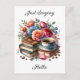 A really pretty ai watercolor illustration of a a stack of vintage books, a cup of tea or coffee and pretty flowers thinking about you postcard. You can change all the text on the card in the personalization area.