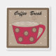 A big red mug of steaming hot coffee on a mocha background with the words Coffee Break.