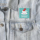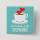Custom employee name button or pin for coffee shops. Turquoise blue, espresso brown, red and white colors. Image features a cup of coffee brewed with love. Use this image or upload your own logo or picture to the space. Personalize with the business name and name of the staff member. Change the blue background color with the Customize It tool (Select Edit, then choose Background color).