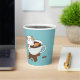 Funny cat relaxing with(in) a coffee, with a croissant.