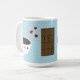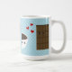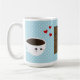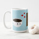 A cute kawaii cup of coffee and bar of chocolate, look sweetly at one another, with three red hearts floating between them. The background is light blue with polka dots.