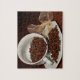 Jigsaw puzzle with a photograph of a white coffee cup and saucer with coffee beans spilling out.