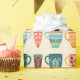 A variety of colorful coffee and tea cups with different floral and heart patterns are arranged in a repeating pattern against a white background. Each cup showcases a unique combination of colors and designs, creating a vibrant and symmetrical display.