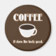 A vector graphic of a coffee cup filled with coffee is in the center with the saying: "COFFEE - it does the body good."