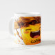 A funny cartoon illustration of a sleepy coffee cup with a yawn and messy hair, holding a sign that says 'But First, Coffee', bold and playful style, bright cheerful colors like yellow and orange, isolated on white background, high resolution, print-ready for a mug, simple and clean lines."