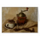 Note card with an artistic photograph of an old-fashioned coffee grinder, coffee cup and saucer filled with coffee beans, both on a burlap bag and more coffee beans.