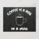Combination of Simple Old Style and Modern Script Coffee Saying postcard. This Designs features of dark deep wooden background with Coffee is a hug in a mug saying written in modern script. Added vintage style coffee mug. All printed in white color. This sign will look great printed on any type of media. Perfect gift for any coffee lover. Decor for coffee bar, coffee shop or restaurants.
