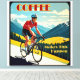 You can ride your bike over high mountains because of coffee and coffee alone. This great design shows a cyclist in the mountains in the style of a retro vintage travel poster.