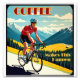 You can ride your bike over high mountains because of coffee and coffee alone. This great design shows a cyclist in the mountains in the style of a retro vintage travel poster.