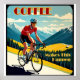 You can ride your bike over high mountains because of coffee and coffee alone. This great design shows a cyclist in the mountains in the style of a retro vintage travel poster.
