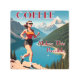 You run over high mountains and do ultra running races because of coffee and coffee alone. This great design shows a runner in the mountains in the style of a retro vintage travel poster.