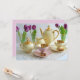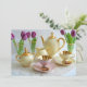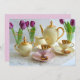 A lovely coffee morning invitation card. Vibrant image features lemon, pink and gold vintage Harlequin coffee service and bright purple tulips. Customize with your own event details.