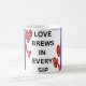 "Love brews in every sip" symbolizes the idea that love, like coffee, is something to be savored and enjoyed slowly. Each sip represents a moment of connection and warmth, much like the small, meaningful moments in a relationship. Just as coffee invigorates and comforts, love brings energy and comfort to our lives. The quote captures the essence of love being a constant, delightful presence in our daily routines.