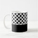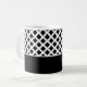 Ceramic coffee mug is shown with a black and white art print.
