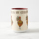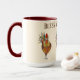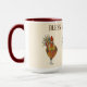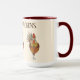 This two tone coffee mug is graced by some pretty colorful chickens to help perk you up with your favorite morning brew. Three chickens along with text reading Bless My Chickens with maroon red interior and handle. Multi colored over Ivory background on white mug. Customize this item or buy as designed.