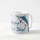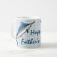 Not many fish are more incredibly beautiful than the blue marlin -- and not many fish are larger. The blue marlin is the largest of the Atlantic marlins and, seriously, one of the biggest fish in the world. As with some species, the female is often quite a bit larger than the male. Females can grow up to 14 feet long and can weigh more than 1,900 pounds, though the average runs more around 11 feet long and 300-ish pounds. A deep blue on top and silvery-white beneath, with a pronounced dorsal fin and a long, lethal, spear-shaped upper jaw (that some refer to as a bill), blue marlins are one of the most easily identifiable and recognizable fish in the world. Marlins are renown for their incredible stamina in a fight when they are hooked, which makes them a trophied favorite of big game fishermen. Though it can also be said of virtually any super big fish, I can't imagine there's much more thrilling to the avid angler than hooking one of these giants and seeing it break water in the fight. This design pays homage more to this majestic fish than the anglers that seek it. For this wonderful coffee mug, two marlins frame a text element, "Happy Father's Day". Obviously, an excellent choice for Father's Day, you are welcome to modify the text to better suit your celebration for your favorite angler.