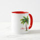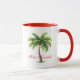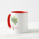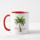 Coffee mug is shown in white with red inside, with a holiday palm trees print. Text says Feliz Navidad.